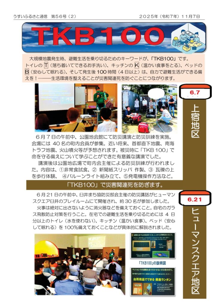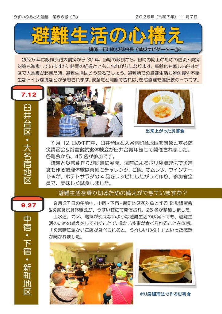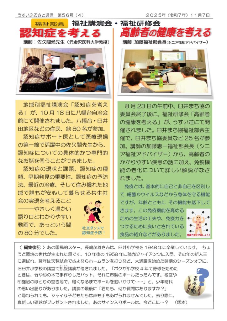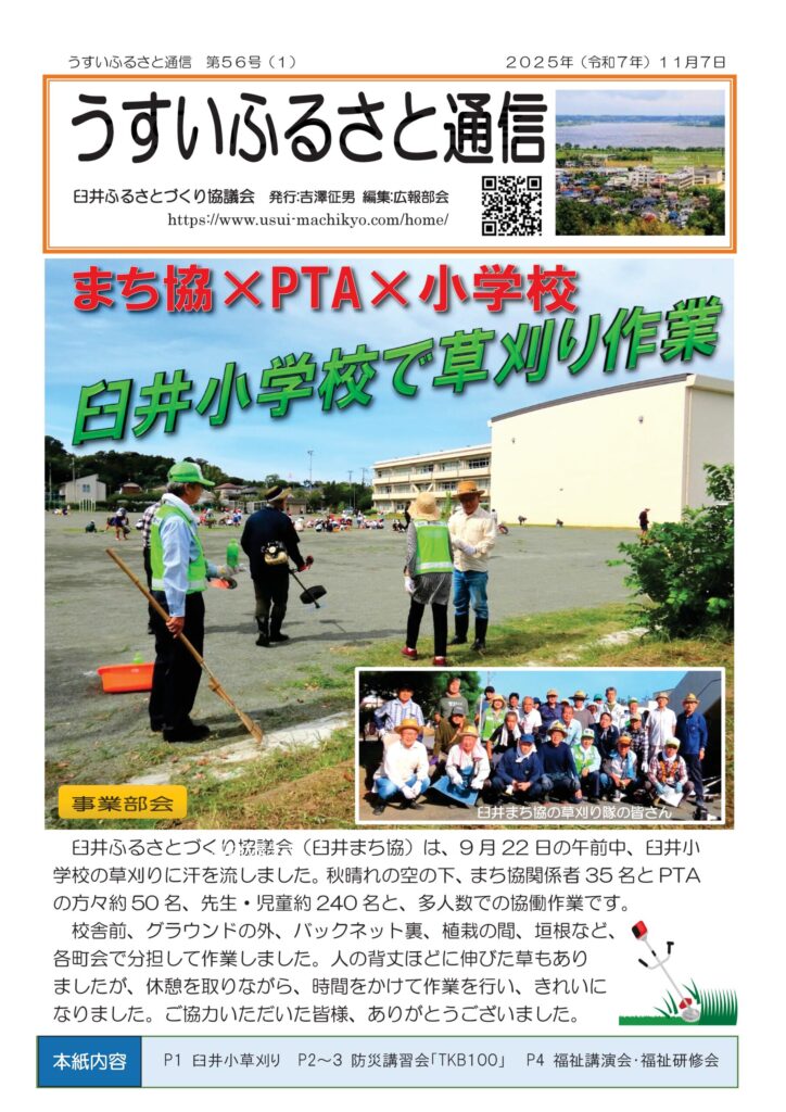 2025年11月7日発行、広報紙『臼井ふるさと通信 第56号』です。〔右開きの4ページ構成〕
